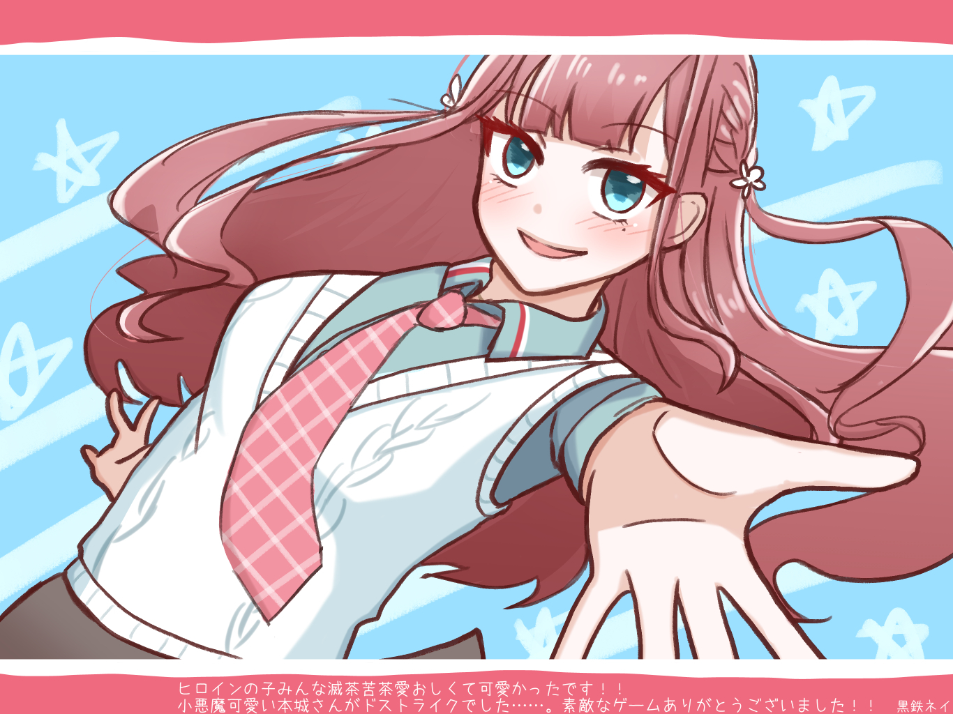 終焉逢瀬フェスあわせでようやくプレイ出来ました! @ネタバレ開始 愛情たっぷり歪なすれ違いがとても素晴らしかったです…! 途中、「うわ!こわ~!」という描写があってハラハラしましたが、めげずに最後までプレイして良かったです。 全貌が分かった時の、叙述トリックを読んだような…これまでのなのいさんの言動の意味が分かった感覚がとても面白くて、過去回想もおまけも、最後まで楽しむことが出来ました。 エンディング時の、ほのせさんと「ホノセ」さん、カナ表記の違いが気になっていたので、過去回想でしっかり補完してもらえてうれしかったです。 なのいさんの萌え袖可愛いなぁ、と思っていたら、義手を隠している意味もあったのですね。 そして、前作に続き、キャラクターが良く動くのが本当に可愛らしい。 演出が細かく、UIも細部まで凝っていて、非常に作りこまれている所はまさに圧巻でした。 特に、カフェでのシーンでは、ほのせさんの目の動きが、立ち絵とデフォルメで連動していて感激しました! ひとつのすれ違いが世界を終焉に向かわせる、暗鬱でハードな作品でしたが、とても好きな味わいでした! @ネタバレ終了 とっても楽しかったです!僭越ながら、イラストを描かせていただきました! 素晴らしい作品をありがとうございました! -