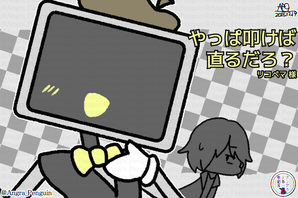 やっぱ叩けば直るだろ?主人公であるジッカーさんがテレビっぽいロボのBK君を叩いて治そうとするお話。 冒頭から既に不穏な気配しか漂っていないBK君に対してジッカーさんの何と冷静な……とリコペマさんワールド全開な最高の作品でした。 @ネタバレ開始 ちょっと不憫なロボットって……良いよね……。 そしてまさかの真相 帽子だけ色違うのはそういうデザインかな~とか思っていたらお前が原因かよ!!!! 果たして他のロボにも効果はあるのだろうか…とか不穏を感じながらも平和に終わるエンドが大変味わい深かったです。 @ネタバレ終了 君も可愛いロボット君を叩いて治そう!そして精密機械は大事にしよう!(?) 素敵な作品をありがとうございました! -