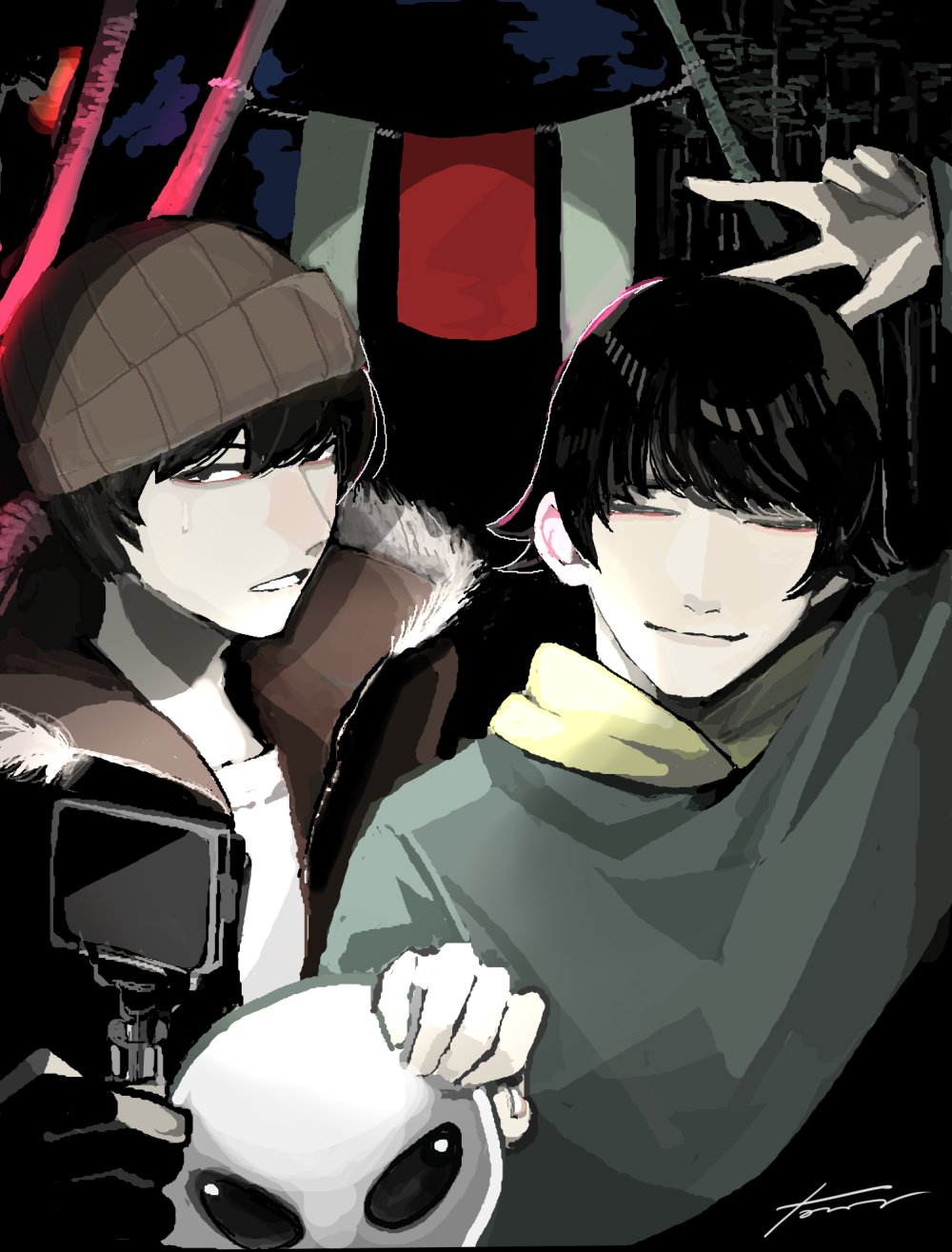 深夜観光TASOGAREずっと楽しみにしていた作品で、とても楽しくプレイさせていただきました。 笑いあり、おふざけあり、即死あり(直前の選択肢まで戻るので安心して飛び込めます!)、涙あり。 ぜひ「あの」エンディングまで見ていただきたい作品です。 とある一夜の出来事。観光地の温泉を堪能したり、夜の街道を散策したり。温泉旅館ではおみやげを買ったり、ゲームセンターでコインゲームを楽しむこともできます。 この町で出会う人、見える景色、聞こえる音。旅先のつながりとわかれ。 夜の寂しさが包み込む町で、幻のようなひと時が楽しめました。 好きなエリアでボーっとしてみたりすると、なんだか旅行に行きたくなってきます。 素晴らしいゲーム体験をありがとうございました! 添付のイラストはクリア後に絵チャで描いた主人公のソウヤくんとノイくんです。 -