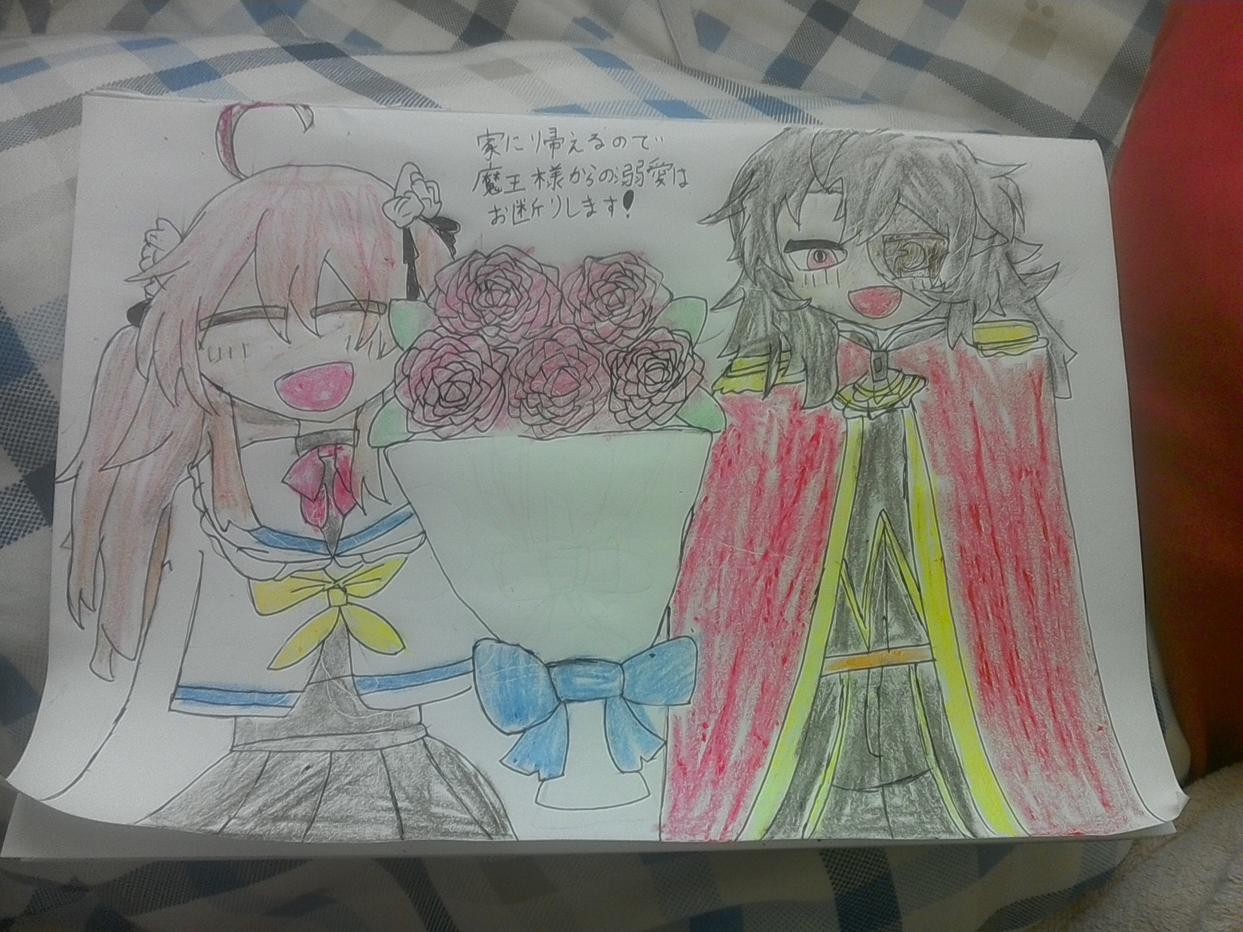 家に帰るので魔王様からの溺愛はお断りします!全ルートやらせてもらいました~! この作品はなんか絵柄好きだなと思いやってみました♪ 最初は絵柄だけでしたがやっていくうちに作品のすべてが好きだなと思えるようになりました!どのルートでもキャラの絡みが面白く、時に切ないような展開やストーリーに時間を忘れて没入できる作品でした! @ネタバレ開始 全ルートを終えたあとにもらえたバッジがすごくかわいくてうれしかったです! 魔王がまさか主人公ちゃんに関わりがあったと知ったときは心臓が飛び出るかと思いました。どうしたらこんな素敵にイラストがかけるのでしょうか? @ネタバレ終了 終わった後あまりにも感動してFAを書いてしまいました~! アナログですみません! これからも応援しています!がんばってください! P.S. 5本のバラの花束には「あなたに出会えてよかった」という意味があるそうです。 -