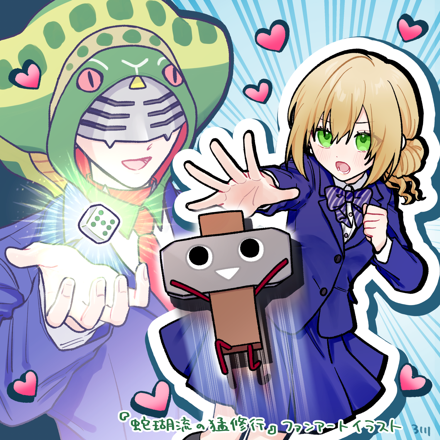 蛇瑚流の猛修行修行したい気分だったのでプレイしました! タイトル画面も素敵!蛇瑚君&ハンマー君、20kmも走るのにこの笑顔…!やっぱり2人とも体力あるんだろうなぁ! 安心感のある手芸部室からのスタートにニッコリ。蛇瑚君がいつも最初に「やあ!」って挨拶してくれるのも好きです。 夢高内を探索できるのも嬉しい! @ネタバレ開始 やはり調べられる場所は全て調べたいので、屋上と念押しされていたのを無視してもちろんバナナも踏みました(?)。滑り落ちるハンマー君も可愛い。 いつもながら遊び方の説明が綺麗にまとめられてるのも親切!イラストも可愛くて好きです! イオンちゃん可愛い!ニコッと笑う差分も素敵。そんなイオンちゃんの代わりに攻撃を一身に引き受けてくれるハンマー君、あまりにもかっこよすぎます。 ハンマー君も蛇瑚君も土の魔法使いなんだ! 蛇瑚君の先月の制作物が技として登場している!!と気づいてテンションが上がりましたし、夢校ロボが魔境クリオネさんに変身するのもわくわくしました!変身ベルトかっこいい。 あとは、ときどきハンマー君の真顔(レアな気がする!!)も見られてハッピーです。 バトルとても楽しかったです!簡単操作&再挑戦しやすい仕様&先の展開が読めない緊張感、どれもすごく良かった! どの技もイラストが凝っていて、さらに表示アニメーションがそれぞれの技の内容に合っていてすごい…! スライドインしたりズームインしたり、細かな演出で技の迫力がより増していました! 奇跡的に全部一発で勝てました!運が良かった!とはいえ見られなかった技もあったのでそれを見るために繰り返し遊んだり、せっかくだしBADEND会話も全部見たかったので、負けるために何度も挑戦したりもしました(謎の状況)。チャプター機能すごく便利! 無事に修行を終えて究極の魔法使いになったイオンちゃん、めちゃくちゃ頼もしい。強そうな姿でも可愛らしいのはさすがヒロインという感じです。 おまけの屋上でヘビロボさんとお話するのも楽しかった✨ そして設定画面のデザインもめっちゃ好きです!音までリアルですごい! 今回のコンフィグ画面テストメッセージも興味深かった!あと私も冷やし中華好きです!食べたい。(←?) ファンアートとして、蛇瑚君のスキル(かっこいい)&指示するイオンちゃん(かわいい)&戦うために飛び出すハンマー君(かわかっこいい)などを詰め込んだイラストも添えてます。 @ネタバレ終了 今回も素敵なゲームをありがとうございます!! -