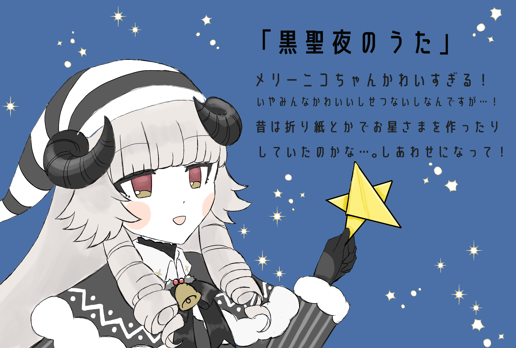 黒聖夜のうたSNSで制作しているのを見ていて可愛らしいキャラクターがどうなるのだろうと気になっていたので、プレイさせていただきました。 @ネタバレ開始 先輩大好きでひたすらに可愛いけど実は影もあるメリーニコちゃん、丁寧で穏やかででもメリーニコちゃんの危機に颯爽と現れる先輩・クララウス先輩、威厳もあるけどお茶目さ(雪だるま作っちゃう)や親しみやすさが勝つ安心の上司・クロヒト大統領、偏見なく優しくでも冷静に世の中を俯瞰するトルエルちゃん…そして悪い子にいい子にたくさんのキャラクターが短い時間の中にたくさん出てきて、充実した早めのクリスマスを過ごせました! メリーニコちゃんが本当に健気で…ハッピーエンドルートでわかるメリーニコちゃんとクララウス先輩の過去(おまけでも明かされていましたが)で「そうだったのか~!」となりました。悪い子にお仕置きをするのがブラックサンタの仕事だけど、子どもを助けたクララウス先輩は初代袋去りの現サンタ王と同じく優しい人ですね。そのことの後に訪れる責任を感じていることも含めて。それをクロヒト大統領が「責任はそんな形でとるものではない」と優しく一喝してその後の采配を取るのもステキだなと思い心が温かくなりました。 @ネタバレ終了 ヒントやおまけ要素などで特に苦戦することなく短時間にギュギュっと詰められたであたたか可愛いを堪能できました。ブラックな要素も少しだけありますが、それをも包み迎えるエンディングは読了後の心も優しく灯してくれます。 ステキな作品と時間をありがとうございました! -