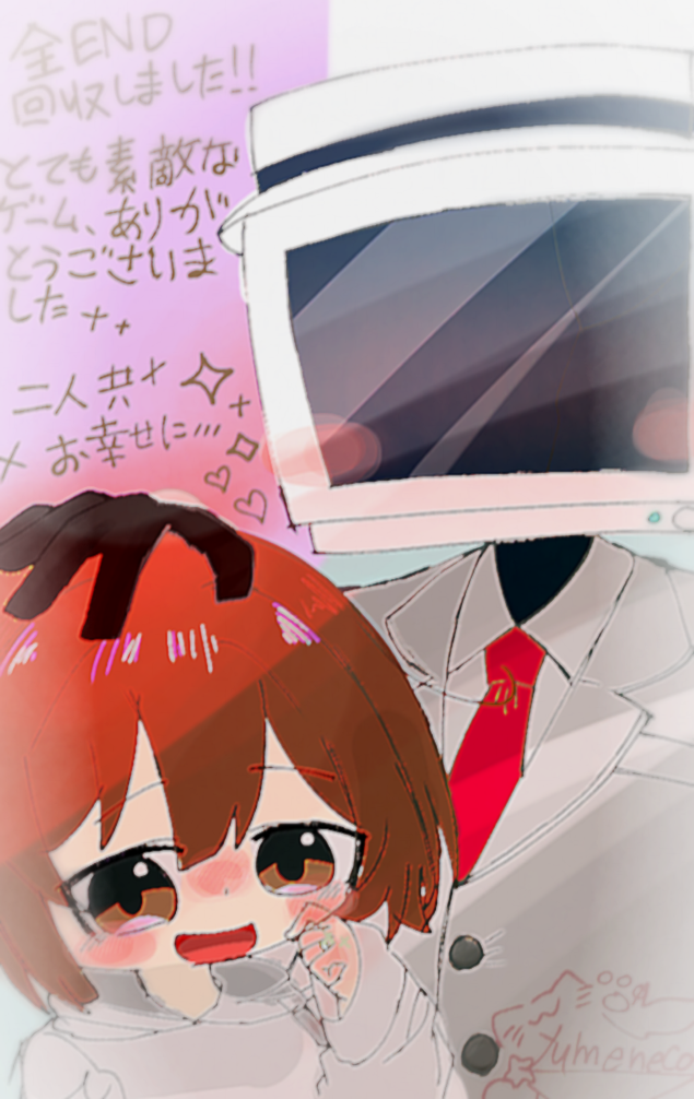 黒聖夜のうた「女の子がカワイイ~!」と思いつつプレイし、「先輩の笑顔美人カワイイ~(だが先輩はニコちゃんの旦那)」となりました。 @ネタバレ開始 以下箇条書きでオンタイムメモした感想なのですが、まとめられる気がしないのでそのまま投稿します。 ・「じゃがいも、木炭、モツ!」の勢いと右下の先輩かわいい…… ・「どう見ても悪い子だとわかるあの子」、路上で一人宴会しとる!!! ・からの空飛ぶじゃがいも、木炭、モツ…… ・食用のモツなんだ…… ・ママさん呼びは先輩だけなのか……(先輩かわいいな……と思ったらニコちゃんもそう思いますか、わかりみが深い) ・起きろ、死ぬぞはどちらかというと凍死しそうなときのやつ!!! ・モツでぶったの!? ・タバコポイ捨てに厳しいニコちゃん…… ・地顔……(微笑むとめっちゃ柔和美人に見えるから大体三白眼のせいじゃなかろか……先輩) ・レスバに対して床にぶちまけすぎぃ!→モツも追加されちゃった……お掃除が大変だ…… ・じゃがいも発注かけてるんだ…… ・なぜか光ってるんだ…… ・大統領の話、脱線著しい…… ・ポイ捨て野郎またいんのか、お前wwww ・老け顔を気にしてる先輩かわいい…… ・ニコちゃんの「えへへ」に対して、「?」しながらも「ふふふ」って返してくれる先輩優しいし、かわいい…… ・>>>突然の醜い争い<<< ・トルエルちゃん可愛いけど……可愛いけど、その姿……? ・「先輩に女いたらどうしよ」のニコちゃん、かわいいお顔が怖い、怖いよ…… ・やっぱり、トルエルちゃんえらい人のとこの子だった……(そりゃ上の意向に対して解像度が高いわな)※ノーマルクリア ・渾身の>>>言っちまった!!!!<<< ・冷や汗だらだらで返事に困ってぺしょっちゃった先輩かわいい…… ・スープないから、お湯……悲しい…… ・大統領は全部お見通しですか…… ・オフの先輩のポニテとメガネ可愛い…… ・大統領wwwww「お兄ちゃん許しませんよ」wwwww ・大統領、雪だるま作っちゃった、カワイイ ・先輩……それは……ぺしょっちゃうよなあ、腰抜かしちゃうよなあ、「不幸なことをしてしまった」と思ってたのに、それはニコちゃんにとって「幸せ」で、つまりは「正解」だったってわかっちゃって、本当に「許された」んだもんなあ…… ・クソ度胸www……ん、歴代2人目……? ・べそべそ先輩かわいい…… ・先輩、そのタイミングはクソ真面目過ぎる、ニコちゃんの心の準備ができないよ ・角が伸びててうれしい先輩かわいい……(ここからオマケ見ました) ・>>>栄えある<<<1人目。それは、大統領、絶対に怒れないよねえ。 ・>>>>未成年だから<<<<、逆に言えば成人すれば余地があるってコト!!! ・あせあせ先輩かわいい…… ・(ダメ)のニコちゃんのこの顔である。 ・交際の普通がわからない&論理的思考強めを逆手にとられて距離感の外堀をせっせと爆速で埋められる先輩……ツヨクイキロ 総評:ニコちゃんも先輩もカワイイね、尊いね……先輩、外堀埋められたし、ちゃんと連れてきた責任も取らなきゃいけないからね。ニコちゃんは強い子だ……先輩も、強く生きろ…… しかし、ブラックサンタの意義や大統領の経緯、そして大統領パートのことを考えると、懲らしめるべき人数は同時に助けるべき人数なのかもしれませんね…… @ネタバレ終了 ブツを「てやー!」するニコちゃんをメインにFAを書かせていただいたのですが、絵柄とモザイク処理の関係でモツが逆に妙にリアルになってしまった気がする…… とても尊い関係の二人の物語をありがとうございました! -