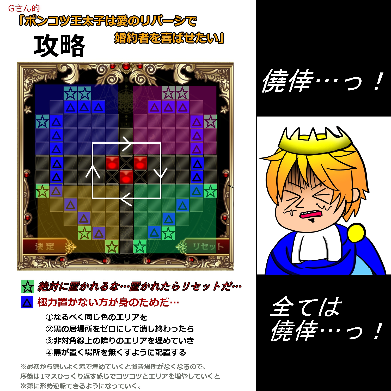 ポンコツ王太子は愛のリバーシで婚約者を喜ばせたいものっっごく中毒性があり、自分のリバーシの腕のポンコツっぷりに 泣きをみました(笑) 有識者様達のおかげで畳みかけられるように負けっぱなしから、 勝てるもののバッジを取れるほどではない程度にはなりました~。 全滅プレイも「お前なら出来るはずだ!」と相手方に声掛けするものの 負ける工程も私が頑張らないといけないのね~と悟りました。 お情けで姫様の美しい笑顔を見られたので、 そこはありがたい限りでございます。 いつか…完全制覇または全滅してみたいです。 楽しく中毒になれる作品をありがとうございました! -