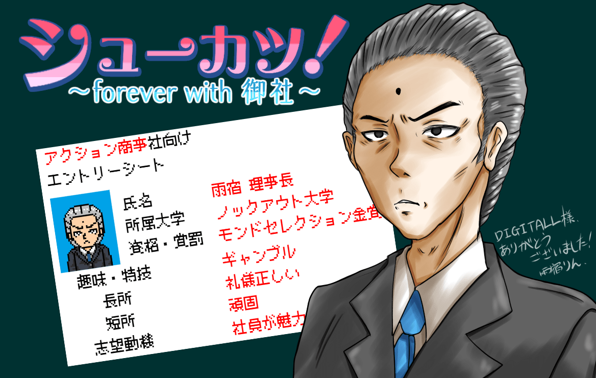 シューカツ! ~forever with 御社~レトロ風、デッキ構築カードゲームで就活! 仕込まれまくったネタの数々、物凄い組み合わせ数のアバター作成、カードも全て見るのは至難の業という作り込まれまくった作品! 最初は難しいですが、やればコツも掴めるし成長して強くなっていくので、周回が楽しくて気持ち良いです! 夢中になって実プレイ時間は曖昧ですが、説明にある通り1周20分~、全エンドで5時間はかかってないかと。少しずつでも遊びやすいです! @ネタバレ開始 今回も速攻で遊ばせていただきました! 流石の内容で夢中の周回。カードはあと2枚が見つけられずです。悔しい! アバターは貫禄ありすぎる大学生を作って遊んだのですが、ファンアートが完全にオジサマになってしまいました。 面接官に「闇バイトは社会人として必要なマナーを身に着けることができそうなので良いですね」という無茶苦茶なことを言われて爆笑。スクショしちゃいました(笑) エントリーシートだけでもネタだらけ、過去作のあの方この方にもお会いできて嬉しかったです! @ネタバレ終了 素晴らしい作品をありがとうございました!! -