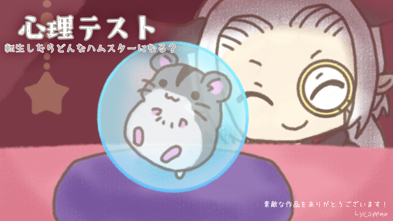 心理テスト~転生したらどんなハムスターになる?~フェスが始まったので、改めてFAを送らせていただきますっ! 診断結果も、占い師さんも、バリエーションたっぷりな診断結果!! キュートなハムちゃんにほっこりしちゃいますっ!! 素敵な作品をありがとうございます! -