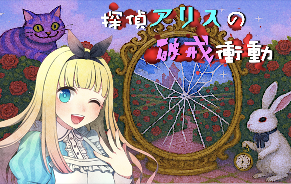 ノックスの十戒を全部破ったミステリー。イカれた住人ばかりの不思議の国で、殺人事件が発生。探偵アリスは、ハートのジャックとチェシャ猫と一緒に、事件の捜査を行います。不思議の国のアリスをモチーフにした(アンチ)ミステリ風謎解きADVです。