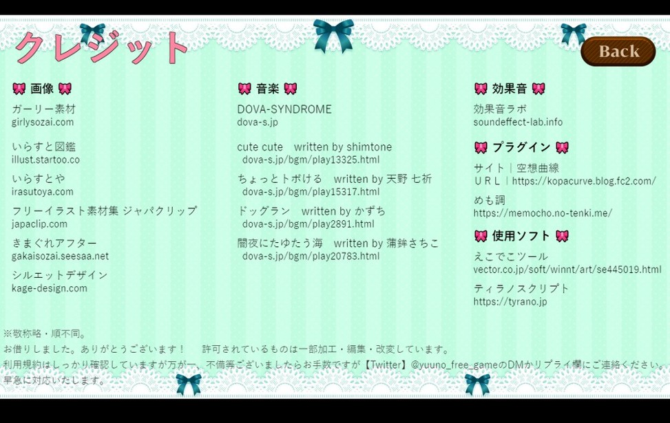ゲーム内で使用している素材の著作権は各素材の制作者にあります。