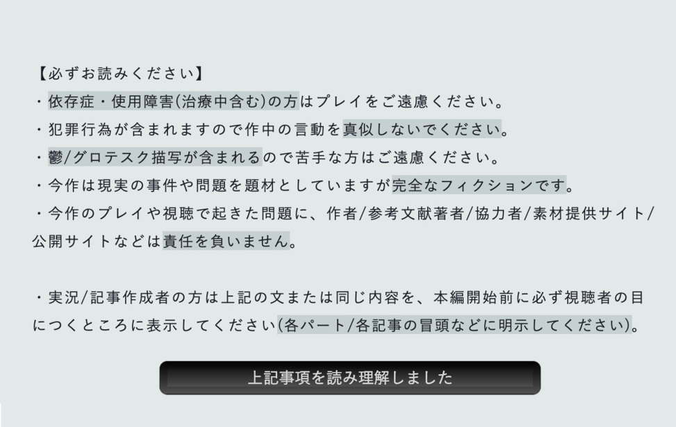 上記の文または同じ内容を、本編開始前に必ず視聴者の目につくところに表示してください(各パート/各記事の冒頭などに明示してください)。
