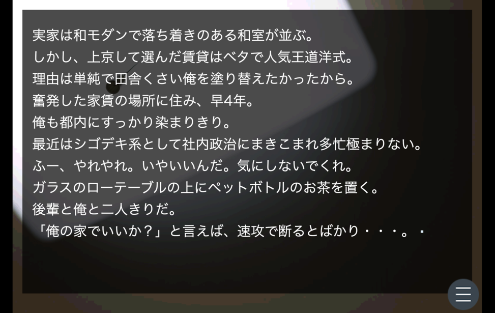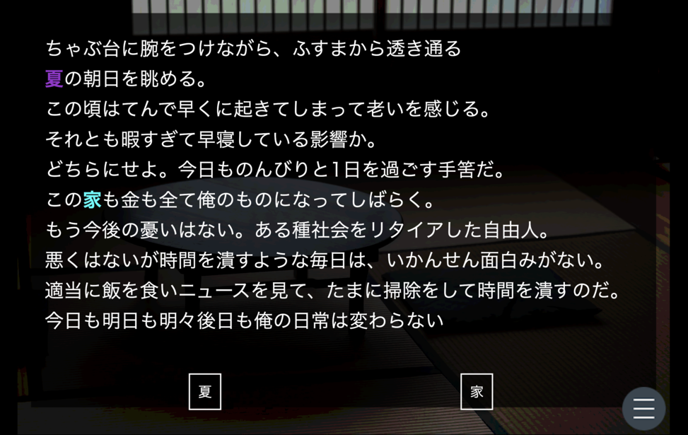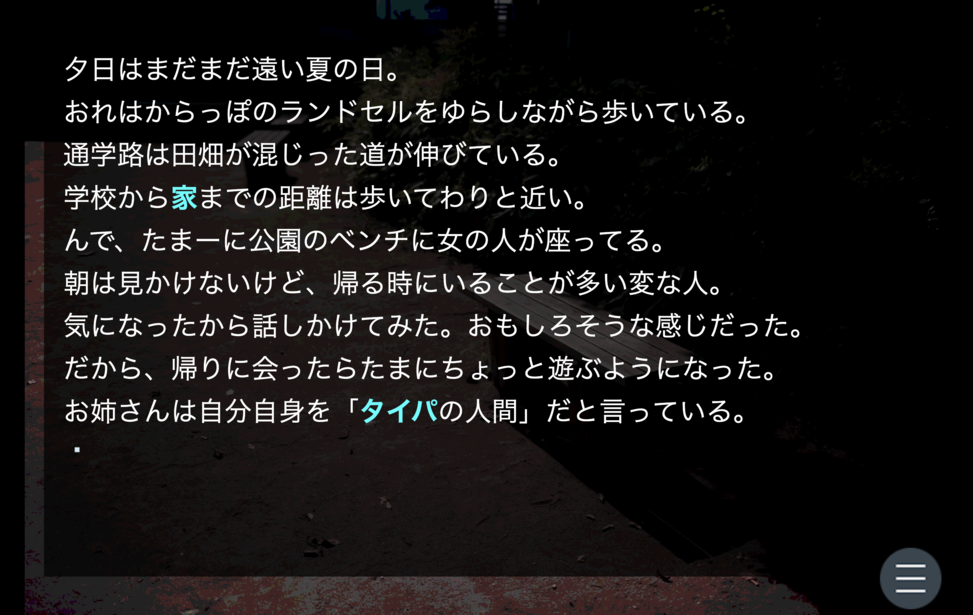 はじめから→家→落ちる予感→手をつかんだ→泣き出した→歩く→家→飲み会→部→疲れていた→空けて→夏→タイパ→同い年らしい女→ここでセーブ