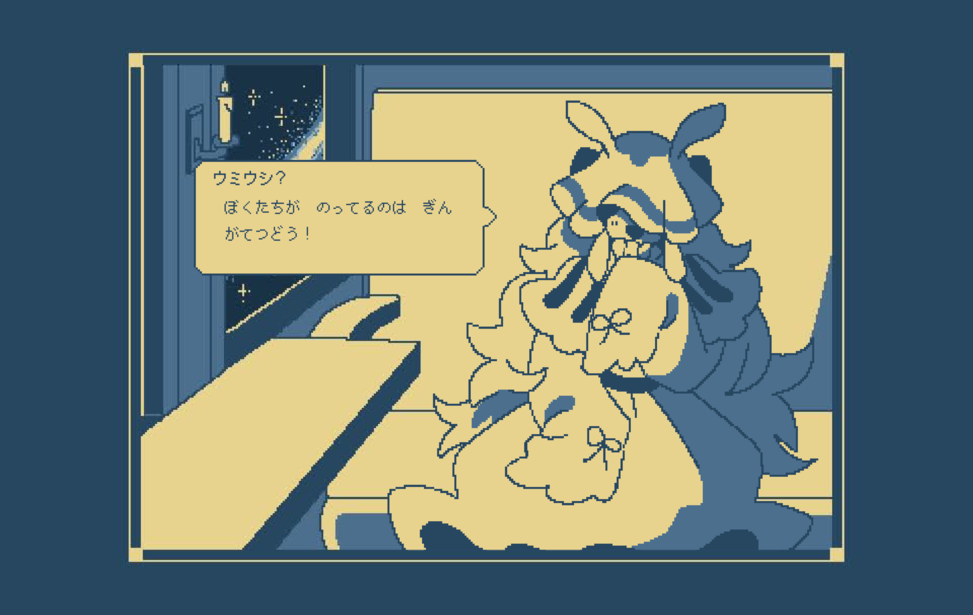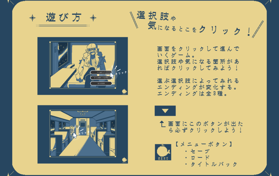 汽車の中で乗客と会話を重ねながらこの汽車がどこに向かっているのかに向き合っていく銀河鉄道ノベルゲーム。
