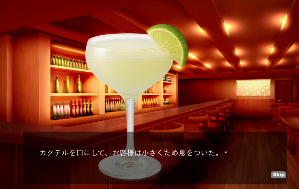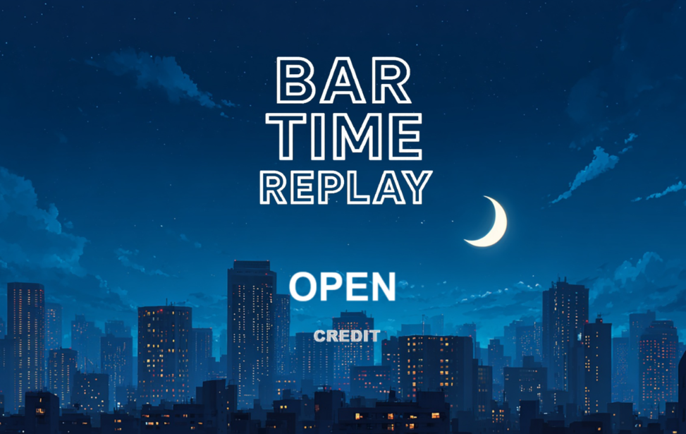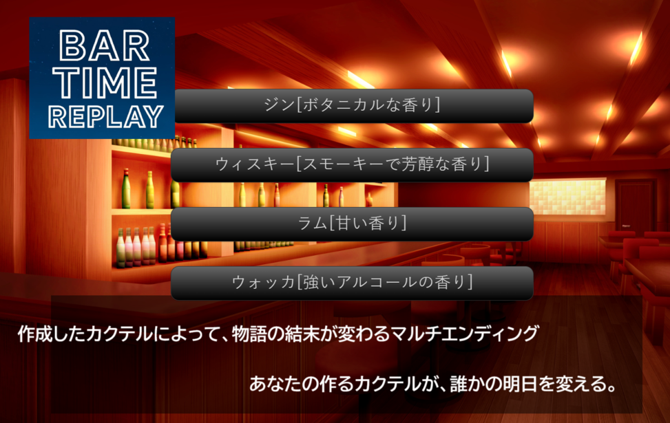 Bar Time Replay web Language English中文(简体)中文(繁體)한국어РусскийDeutschFrançaisEspañolPortuguês日本語 プレイ時間:15分 評価 1 [カクテル作成ノベルゲーム]あなたの作る一杯が、物語を変えていく 『BAR TIME REPLAY』は、プレイヤーがバーのマスターとなり、訪れる人々の悩みを“カクテル”で導くノベルゲームです。 作成したカクテルによって、物語の結末が変わるマルチエンディング(10エンディング)。 あなたの役目は、彼らの話を“聴き”、そして“カクテル”で答えること。 ——あなたの作るカクテルが、誰かの明日を変える。 すべて表示折りたたむ ゲーム実況OK #マルチエンディング #実況可 #Yattazetto コインで作品を応援する ブラウザでプレイゲームをプレイする windowsPC(Windows)版をDL starempty評価 star star star star star heartempty追加 twitter共有 コメント 応援コメント・ファンアートを気軽に投稿しよう! 投稿するには、ノベルゲームコレクションへの参加が必要です。 ノベルゲームコレクションへ参加する もっと見る