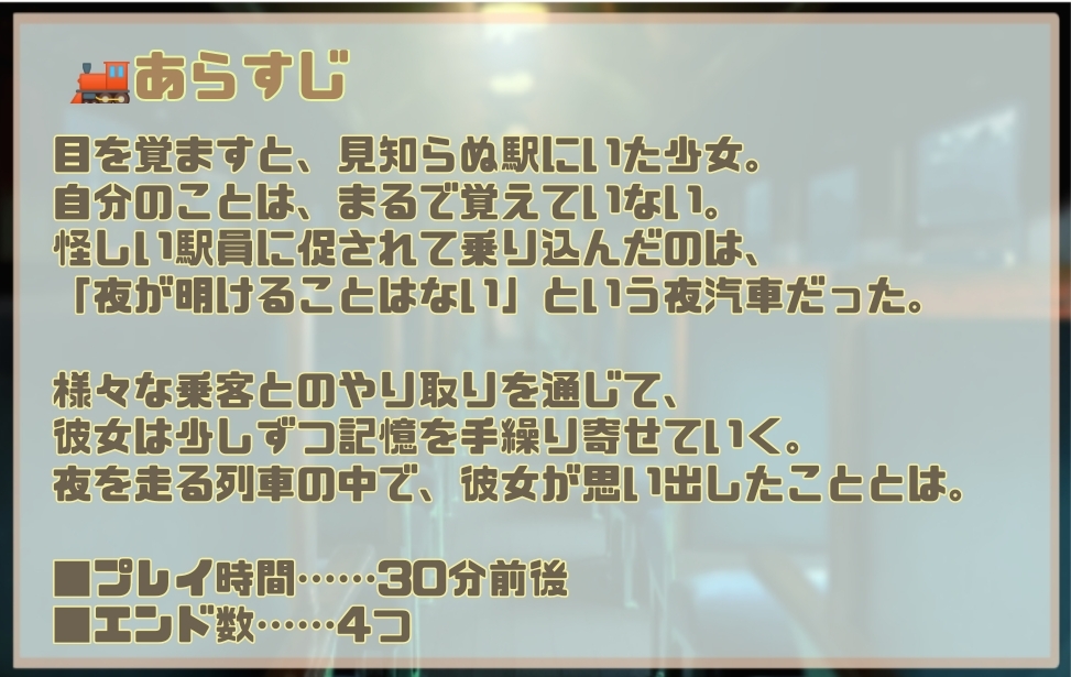 怪しい駅員に促されて乗り込んだのは、「夜が明けることはない」という夜汽車だった。