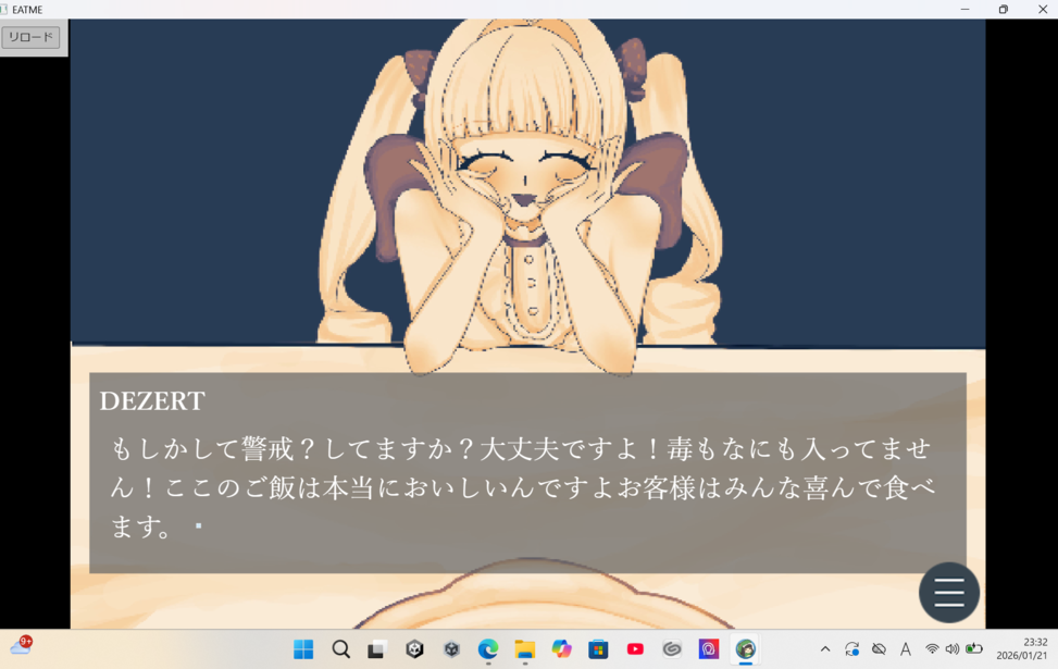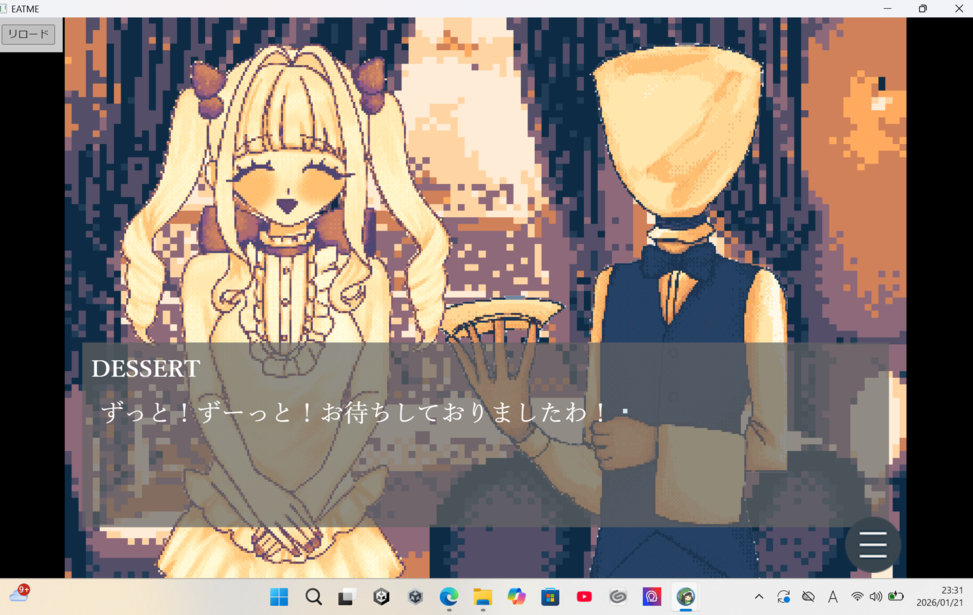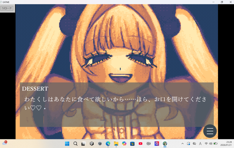 EAT ME web Language English中文(简体)中文(繁體)한국어РусскийDeutschFrançaisEspañolPortuguês日本語 プレイ時間:30分 評価 1 性欲と食欲の混沌とした 美しく残酷で甘い時間 どうかごゆっくりお召し上がりください すべて表示折りたたむ ゲーム実況OK コインで作品を応援する ブラウザでプレイゲームをプレイする windowsPC(Windows)版をDL starempty評価 star star star star star heartempty追加 twitter共有 コメント 応援コメント・ファンアートを気軽に投稿しよう! 投稿するには、ノベルゲームコレクションへの参加が必要です。 ノベルゲームコレクションへ参加する もっと見る