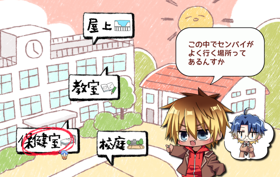 保健室→体育館→校舎裏