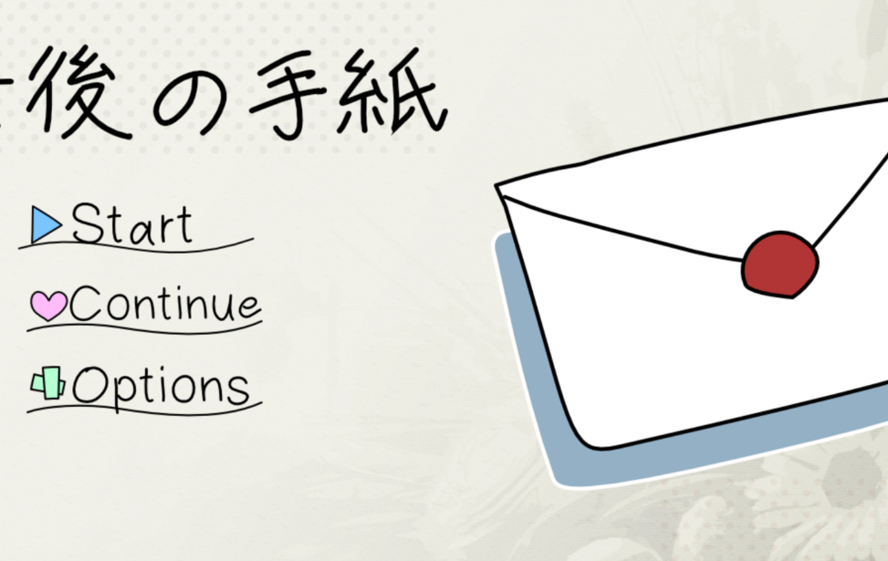 最後の手紙 web Language English中文(简体)中文(繁體)한국어РусскийDeutschFrançaisEspañolPortuguês日本語 プレイ時間:15分 さくっと遊べるノベルゲームです。 よかったらプレイしてみてください。 モチベになるので感想も待ってます。 【エンド】全3つ 【制作】展性系おもち すべて表示折りたたむ ゲーム実況OK ミステリー 手紙 謎 コインで作品を応援する ブラウザでプレイゲームをプレイする windowsPC(Windows)版をDL starempty評価 star star star star star heartempty追加 twitter共有 コメント 応援コメント・ファンアートを気軽に投稿しよう! 投稿するには、ノベルゲームコレクションへの参加が必要です。 ノベルゲームコレクションへ参加する もっと見る