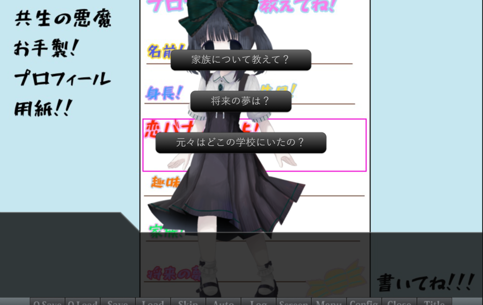 エンドロールにワタシの名前がない web Language English中文(简体)中文(繁體)한국어РусскийDeutschFrançaisEspañolPortuguês日本語 プレイ時間:1時間以上 主人公、葛木頼人(クズキヨリト)は教育実習生。 しかし、実習先の学校はまさかの女子校⁉ コミュ障過ぎる葛木は、悪魔と契約して女子生徒のプロフィールを集めることに。 葛木の実習と時を同じくして、実習先のクラスに転校生、久慈千歳(クジ チトセ)がやってくる。 人と距離を取りすぎる小動物系女子、久慈千歳の情報を葛木は集めることができるのか……! 架空少女創造機関の最初の作品です! プレイヤーの皆様の感想や実況をお待ちしています! エンド数 7 すべて表示折りたたむ ゲーム実況OK 恋愛 コインで作品を応援する ブラウザでプレイゲームをプレイする windowsPC(Windows)版をDL starempty評価 star star star star star heartempty追加 twitter共有 コメント 応援コメント・ファンアートを気軽に投稿しよう! 投稿するには、ノベルゲームコレクションへの参加が必要です。 ノベルゲームコレクションへ参加する もっと見る
