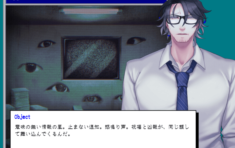謎の会社員らしき男性NPCとお話をする、少し不穏なADVゲーム。