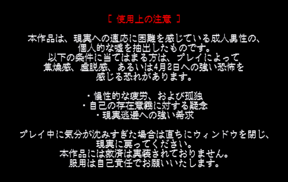 ・このゲームはフィクションです。実在の人物や団体、事件等とは一切関係ありません。又、自殺や自傷、犯罪行為等を助長する意図は一切ございません。