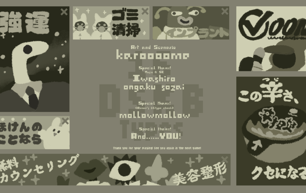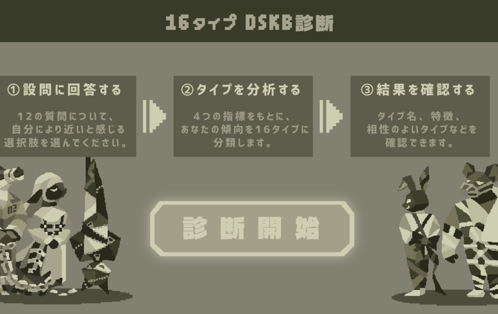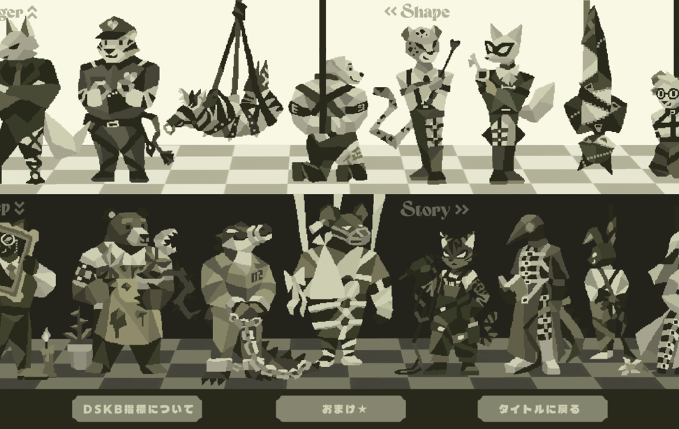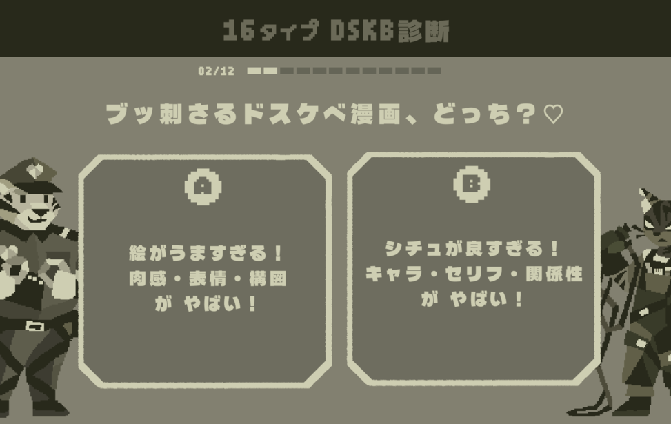 16 DSKB Types web Language English中文(简体)中文(繁體)한국어РусскийDeutschFrançaisEspañolPortuguês日本語 プレイ時間:15分 【所要時間5分-10分】 16タイプ DSKB(ドスケベ)診断へようこそ! 4つの指標であなたのDSKB(ドスケベ)傾向を分析します。 各設問に正解・不正解はありません。 もっとも自分に近いと感じる選択肢を直感的にお選びください。 回答結果からあなたにもっとも近い16タイプのうち1つが表示されます。 -------------- 直接的な描写はありませんが、若干際どい質問もありますのでご注意ください! 音あり推奨です★ すべて表示折りたたむ ゲーム実況OK ケモノ コインで作品を応援する ブラウザでプレイゲームをプレイする windowsPC(Windows)版をDL starempty評価 star star star star star heartempty追加 twitter共有 コメント 応援コメント・ファンアートを気軽に投稿しよう! 投稿するには、ノベルゲームコレクションへの参加が必要です。 ノベルゲームコレクションへ参加する もっと見る